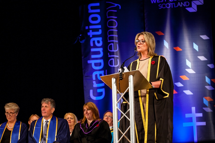 Picture above: West College Scotland Principal & Chief Executive, Audrey Cumberford, congratulating Graduates at the first of the College’s Graduation ceremonies, taking place this Thursday 5 November at Clydebank Town Hall.