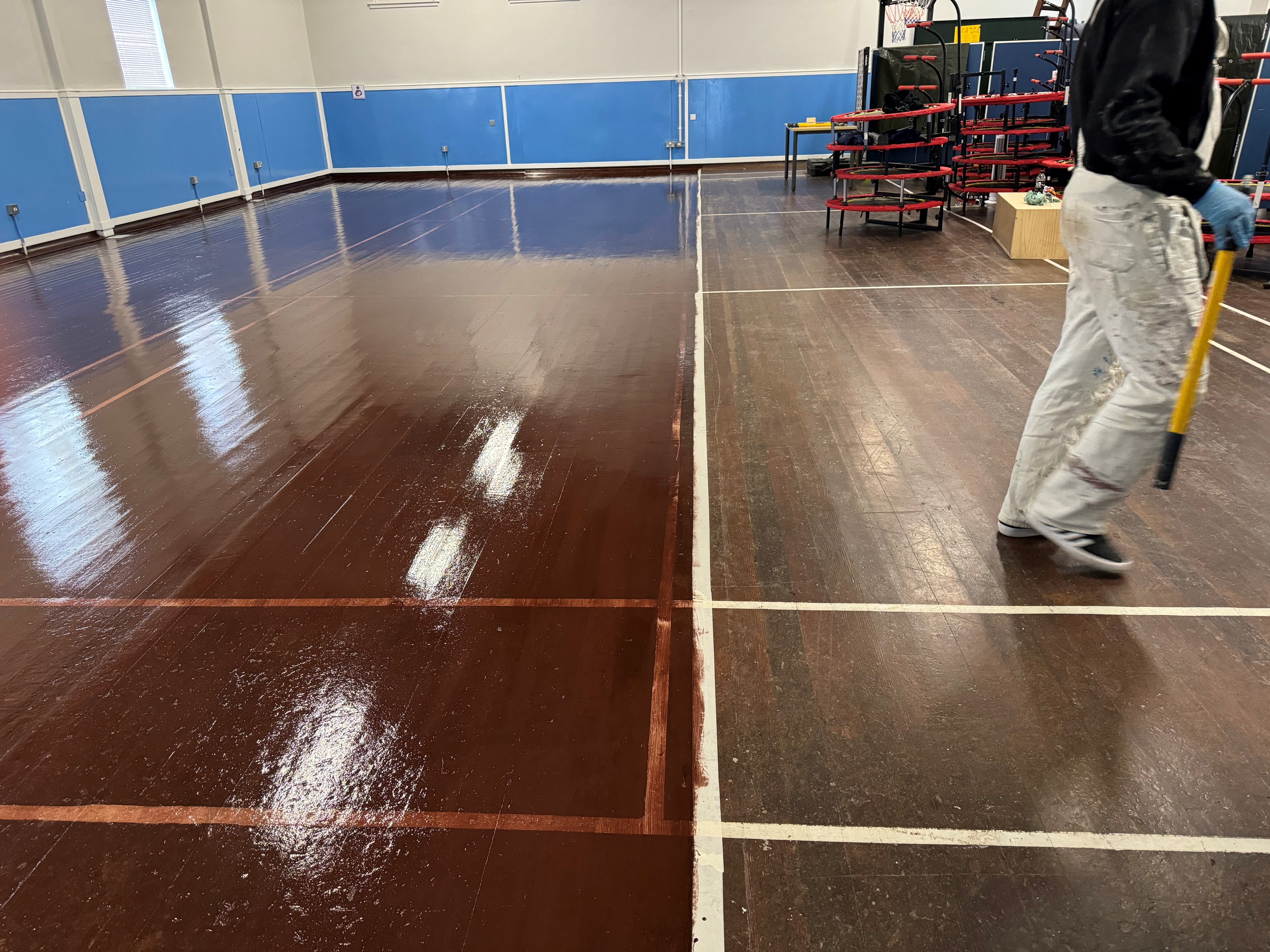 The project involved comprehensive flooring work, which included sanding and preparing the floor surface, applying a hard-wearing floor stainer, varnishing to provide a durable finish, and adding demarcation and white lining on the floor for clear visibility.