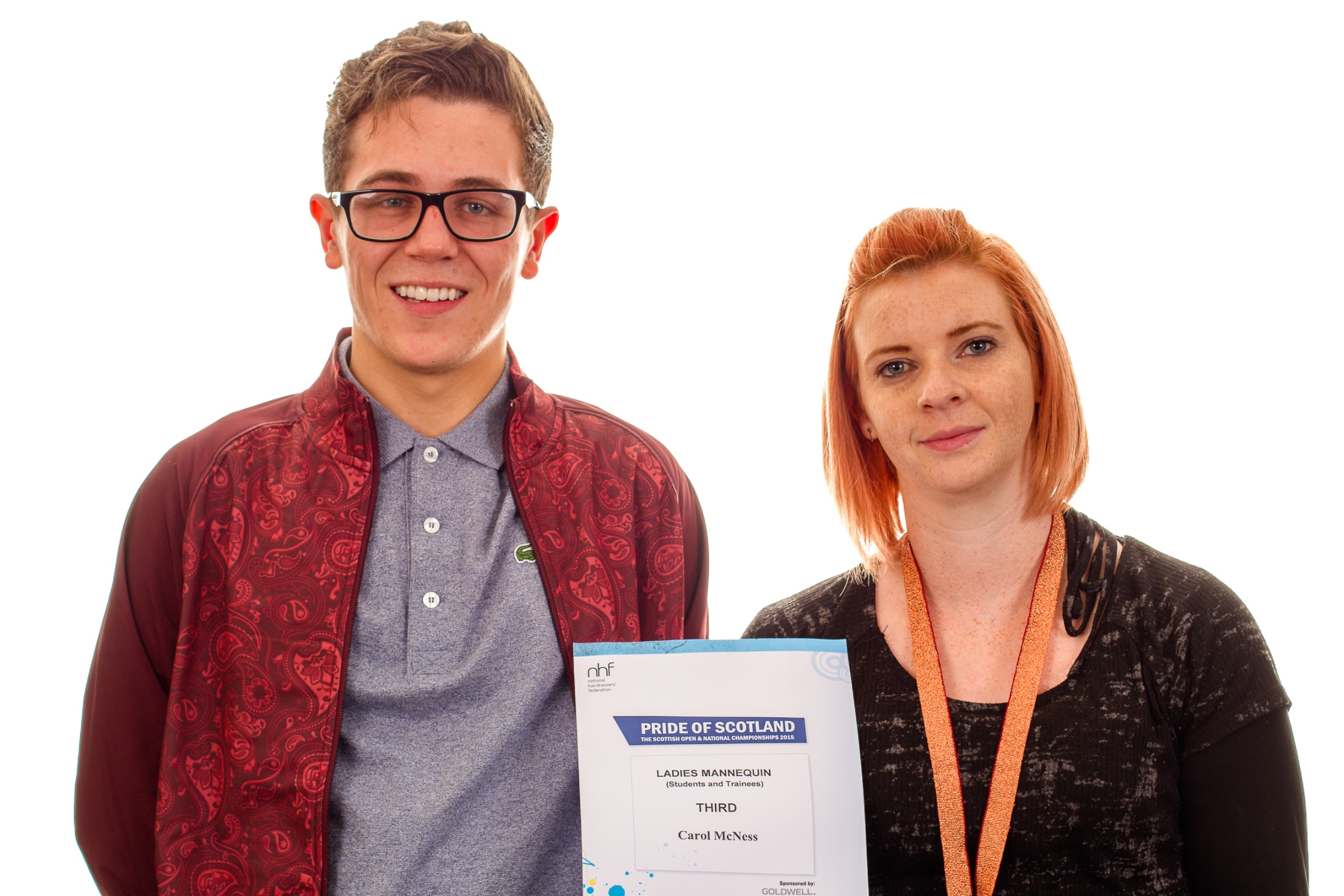Kieran Boswell is a Modern Apprentice with the College, and Elements Salon in Largs. Carol McNess completed a level 2 NC this year, and has successfully found employment with Hairline Salon in Johnstone. Both competed in the Ladies Mannequin Freestyle category, with Carol winning Bronze, and Kieran winning Silver.