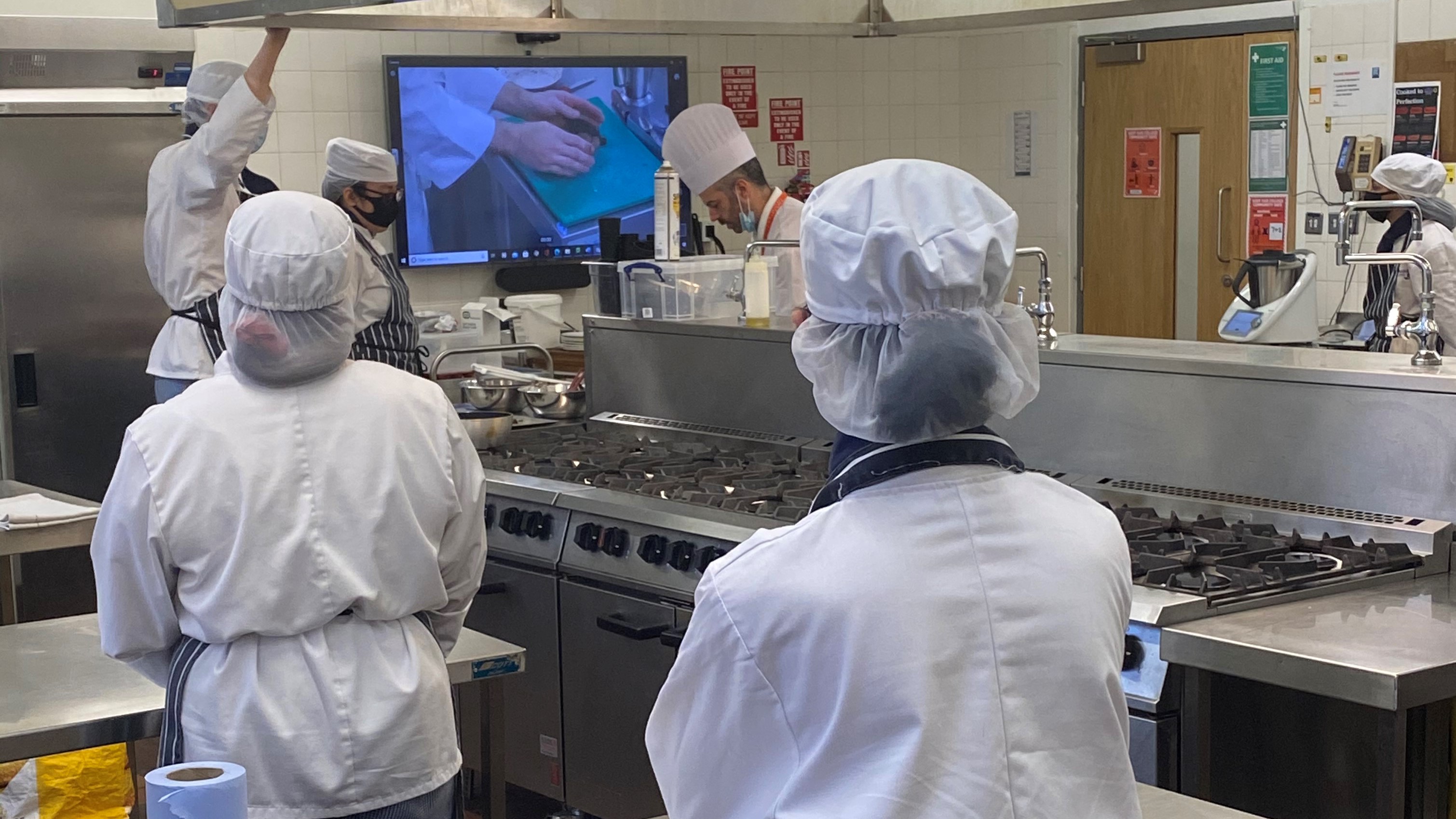 Professional Cookery Level 5 student, Qiao Ling Cheung said, “Pre covid we’d have huddled around the demonstration area  but we’ve not been able to do that due to social distancing so it’s been hard to see exactly what’s going on. Being able to watch the demonstrations on screen from our own stations is great.”