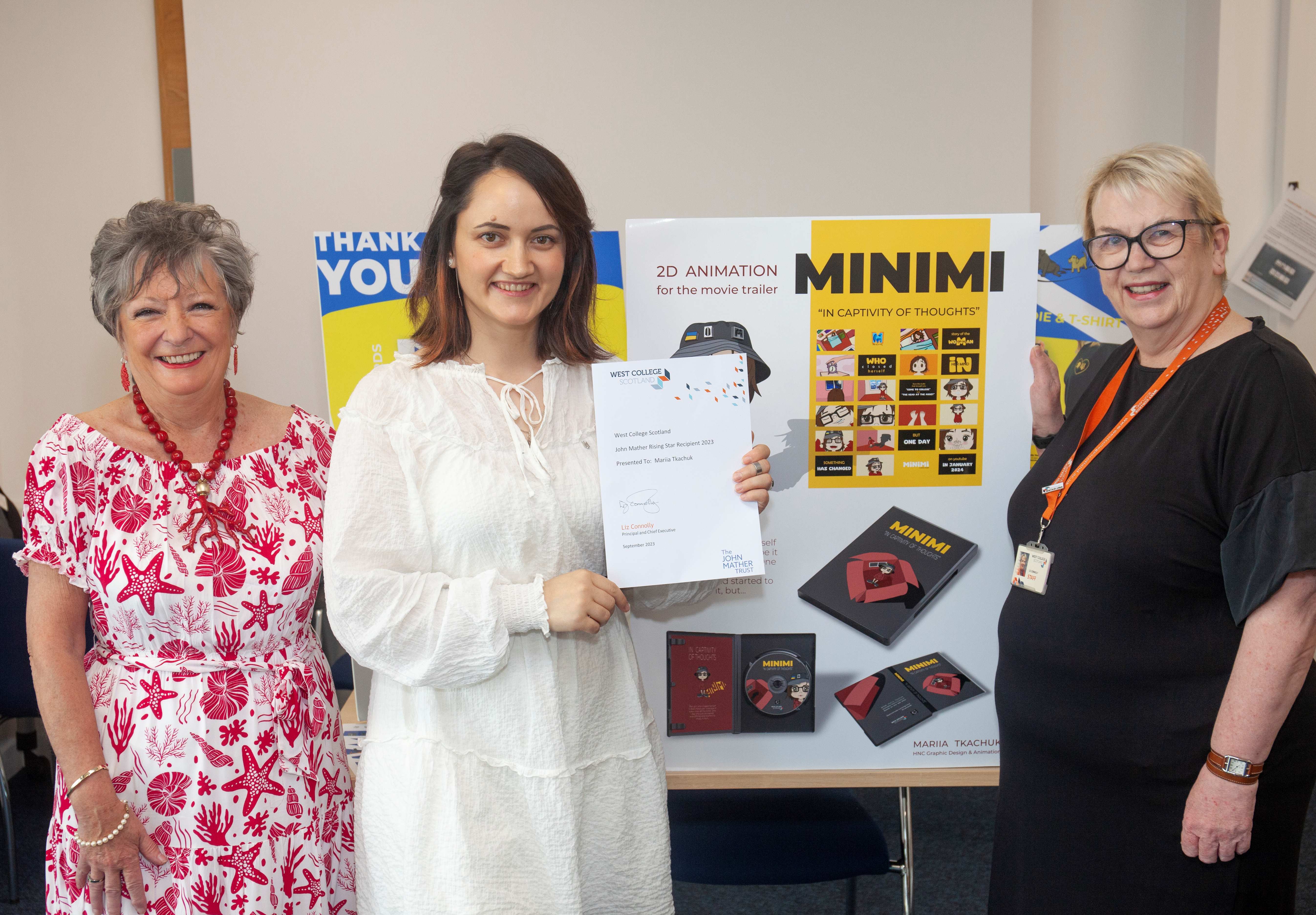 Gathering at the Colleges Clydebank campus on Friday 8 September, Mariia was joined by Trustee of John Mather Trust, Marlynn Mackay, members of senior management, and lecturing staff as she was presented the award by the Colleges Principal, Liz Connolly.