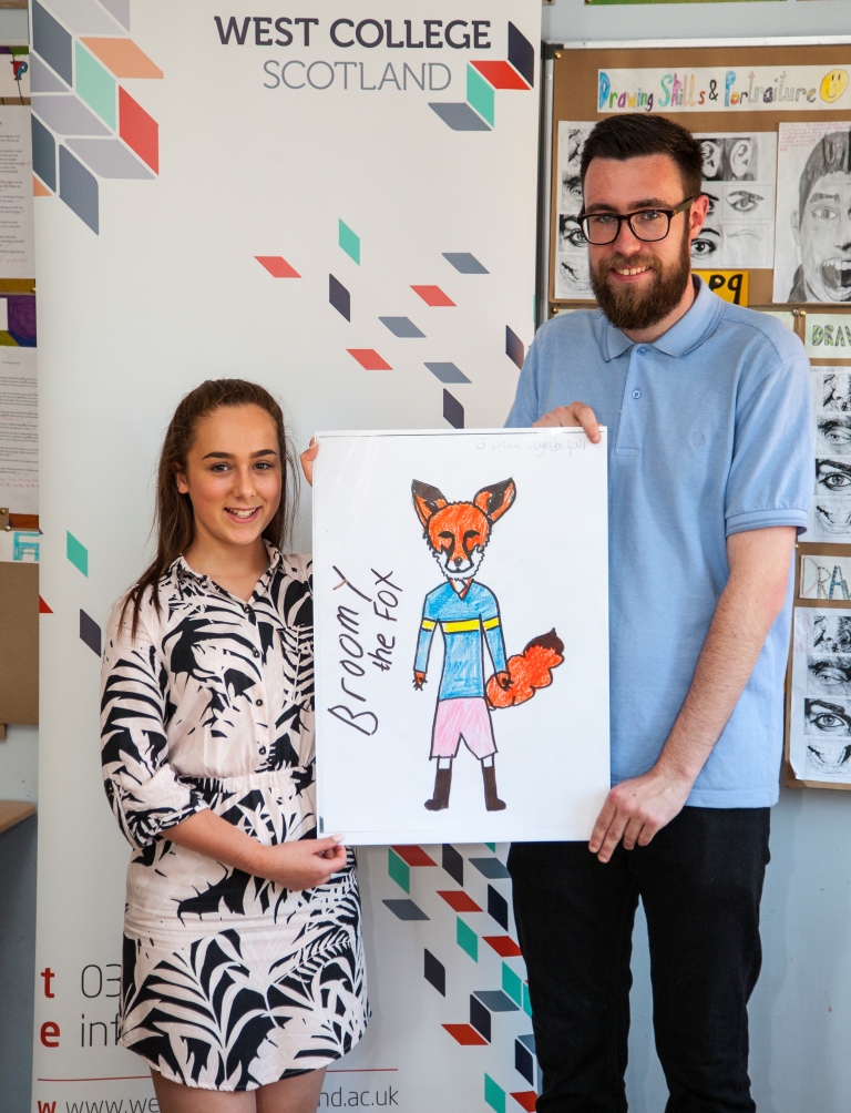 Sophia is a first year pupil at Hyndland Secondary, in Glasgow’s West End and she created Broomy the Fox for a competition run by HND Media students at West College Scotland’s Clydebank Campus.  The brief set by the club and College was to design a mascot which would define the ethos of Broomhill Sports Club, which aims to encourage participation by boys and girls in enjoyable activities that promote health and well-being.